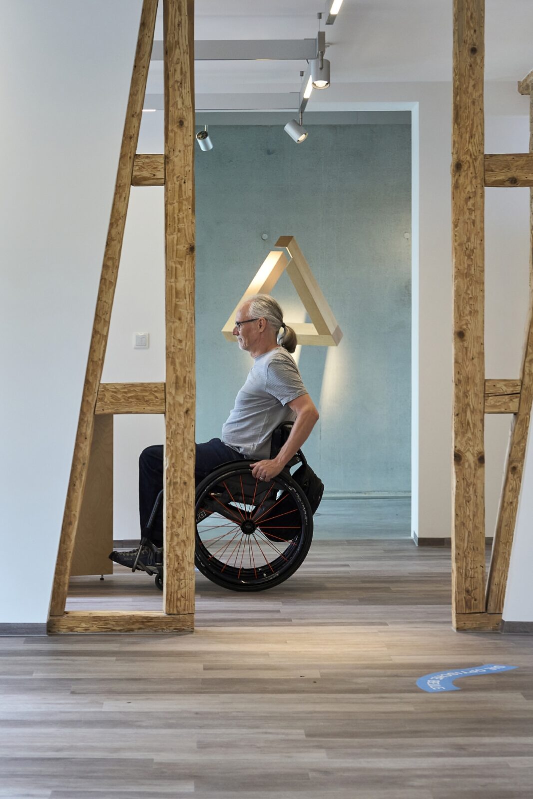 Der Zugang zu den Stockwerken und zu der Ausstellung ist fast vollständig barrierefrei. Einzige Ausnahme ist ein kleiner Bereich im 2.OG. Dieser ist derzeit nur über zwei Stufen erreichbar, da es keine Möglichkeit zur Installation einer Rampe gibt.