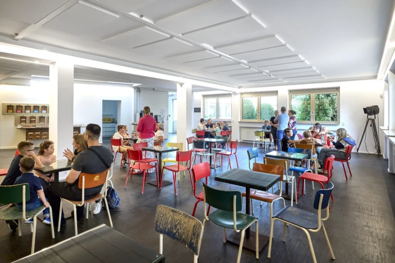 Wir stellen Ihnen in unserer Cafeteria einen Tisch für den gebuchten Zeitraum zur Verfügung. Hier dürfen Sie gerne mit Ihrer Klasse eine Vesperpause einlegen—und Ihre mitgebrachten Speisen verzehren. Wasser gibt es an unserem Spender gratis.